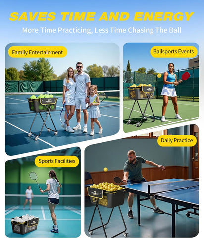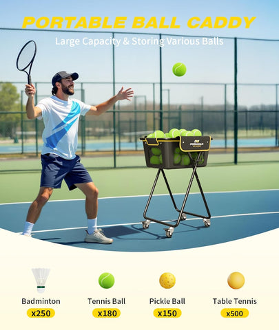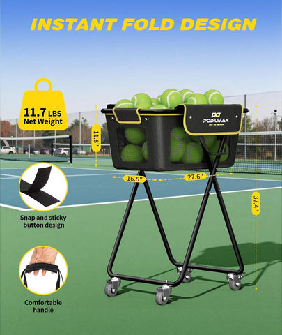 • FOLDABLE DESIGN & EASY PORTABILITY: Featuring a foldable design and smooth-rolling wheels, this pickleball accessory is incredibly easy to transport and store. The compact design allows effortless court-to-home portability, while the wheels make moving it a breeze, even when fully loaded. When not in use, the tennis ball storage cart folds down to save space