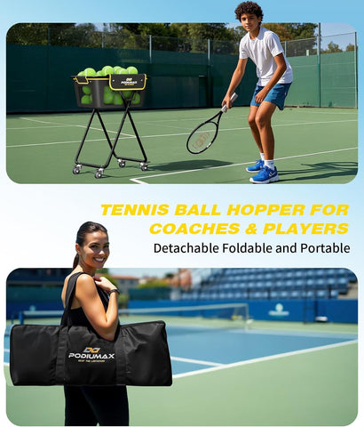 PodiuMax Pickleball Tennis Ball Hopper, Holds 180 Tennis-Balls or 150 Pickle Balls, Foldable Pickleball Caddy for Men Women Teen, Waterproof Tennis Ball Basket for Learners & Coaches