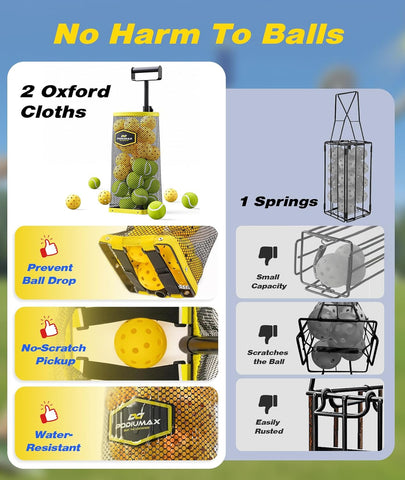 - 600D Oxford Cloths, Efficient Pickup: Equipped with two tough nylon pickers, Tennis ball pickup protects your pickleballs and tennis balls from scuffs and adds extra grip, so you can pick balls up effortlessly, even on sand or sloped ground, with no debris picked up. Just clean and easy pickup