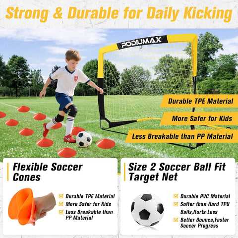 - Practical Soccer Goal Set for Kids: This kids’ soccer goal net includes everything you need. 2 of 4x3 ft pop up soccer goal, 1 target net, 2 goal targets, 1 size 2 soccer ball, 1 pump, 10 training cones, 10 U-shaped metal stakes, and 1 carry bag. No need to buy extra parts, as it saves more time and effort. Kids can start playing right away, and more engaging and enjoyable for kids. Encourages kids to be active and creative, With this durable set, you get the most out of your money