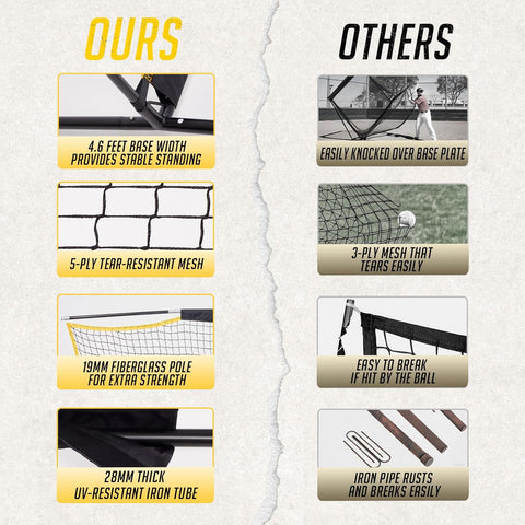 - 4.6FT Wider Base for Stand Steadily: The soccer baseball backstop net designed for high-intensity use, its base is 40% wider than standard bases, ensuring it won't collapse even under strong impacts. The sports netting for backyard barrier constructed from 28mm steel with a powder-coated finish, it offers weather resistance and long-lasting durability