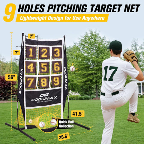 - No Catcher Needed for Solo Training: This portable 9-hole pitching net helps you hone your pitching accuracy and build muscle memory. Featuring a 56“ x 36.6” x 41.5" hitting zone, pitching target requires no catcher assistance. Perfect for solo pitching practice in your backyard, park, or garage, suitable for baseball players of all ages and skill levels