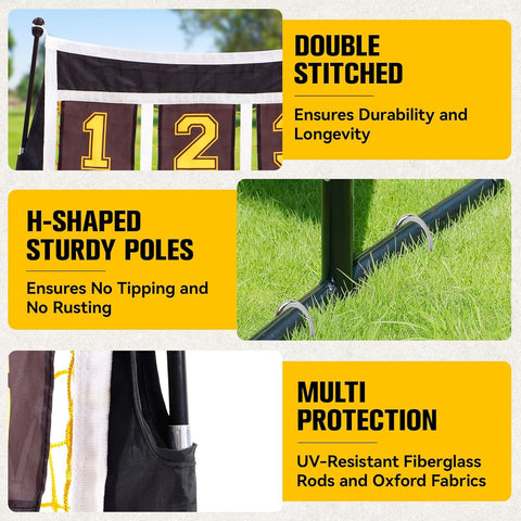 - H-Shaped Base for Stable Standing: Featuring an H-shaped base and 32mm stainless steel tubing, this baseball hitting net is built for all-weather use, equipped with four ground spikes for secure anchoring, it remains steadfast even in strong winds or during intense practice sessions. This pitching net with strike zone is the ultimate choice for baseball enthusiasts